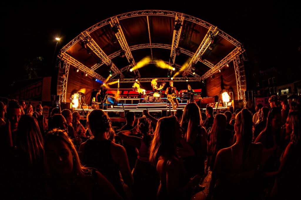 Daarnaast maakt de constructie het mogelijk om eenvoudig een backstage-ruimte te creëren. Zo kan de techniek achter het podium droog en beschermd worden opgesteld, wat bijdraagt aan een professionele uitstraling én een betrouwbare uitvoering van ieder evenement.
